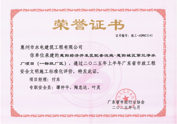 近日,由惠州水務(wù)集團(tuán)水電公司承建的惠陽經(jīng)濟(jì)開發(fā)區(qū)配套設(shè)施—惠陽城區(qū)第三凈水廠項目(一標(biāo)段廠區(qū)),順利通過2025年上半年“廣東省市政工程安全文明施工標(biāo)準(zhǔn)化”評價。這一榮譽不僅是對市水電公司項目管理與施工水平的高度肯定,更是對他們始終堅持高標(biāo)準(zhǔn)、嚴(yán)要求推進(jìn)安全文明施工的生動詮釋,為行業(yè)樹立了可借鑒、可推廣的標(biāo)桿典范。